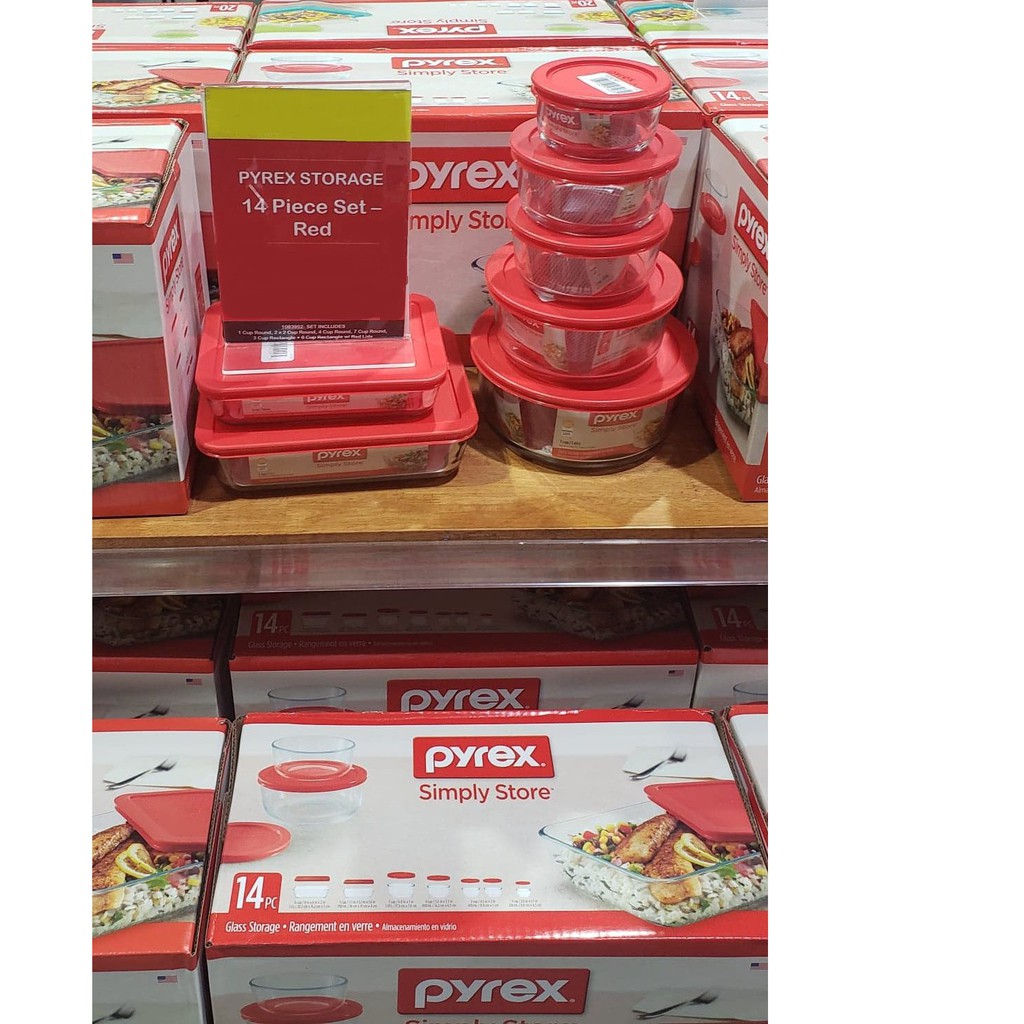 Grand Chute Check Nearby Stores. Pyrex glassware 14-piece storage set with attractive red plastic covers Two 2-cup round bowls with coversOne 4-cup round bowl with cover One 1-cup round bowl with cover One 3-cup rectangle storage with cover One 6-cup rectangle storage with coverOne 7-cup round bowl with cover SKU. This 14-piece Pyrex Storage Set is designed to meet a variety of needs.