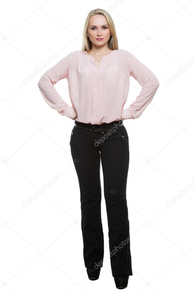 Girl In Pants And Blous Isolated On White Background Body Language Legs Wide Apart Hands On Hips Call Ready To Go Fists Aggression Stock Photo Image By C Kopitin 91675056